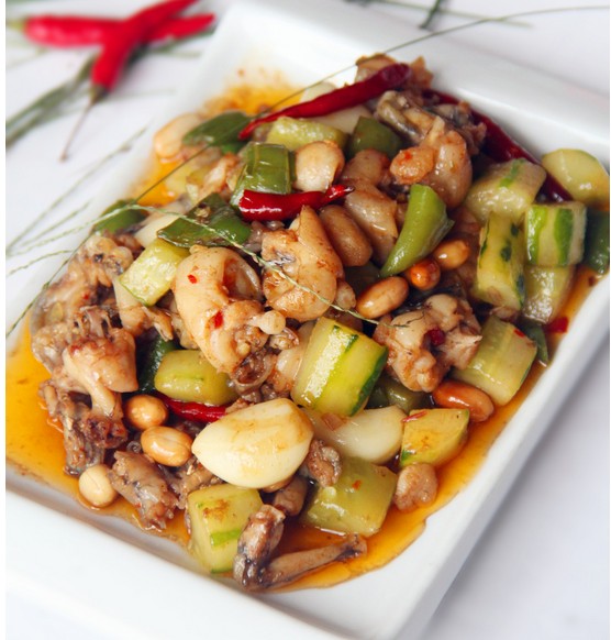 原料:田鸡 适量、青椒 适量、凉瓜 适量、花生米 适量、姜 适量、蒜 适量、红椒 适量、食用油 适量、酱油 适量、醋 适量、豆瓣酱 适量、盐 适量、鸡精 适量、糖 适量、调味料。
