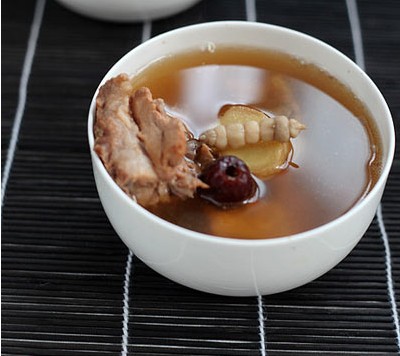 原料:排骨400克、灵芝、北芪、党参、狗牙片、地蚕、玉竹、干葛、枸杞、红枣适量(以上的煲汤料在中药店都可以买到,每样放一点即可)、姜4片、盐、调味料。