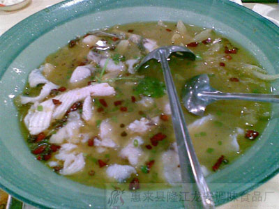 4、将锅内汤汁熬出味后,把鱼片抖散入锅。用另一锅入油烧热,把泡癞椒末炒出味后,倒入汤锅内煮1至2分钟。待鱼片断生至熟,加入味多宝,倒入汤盆子中即成。